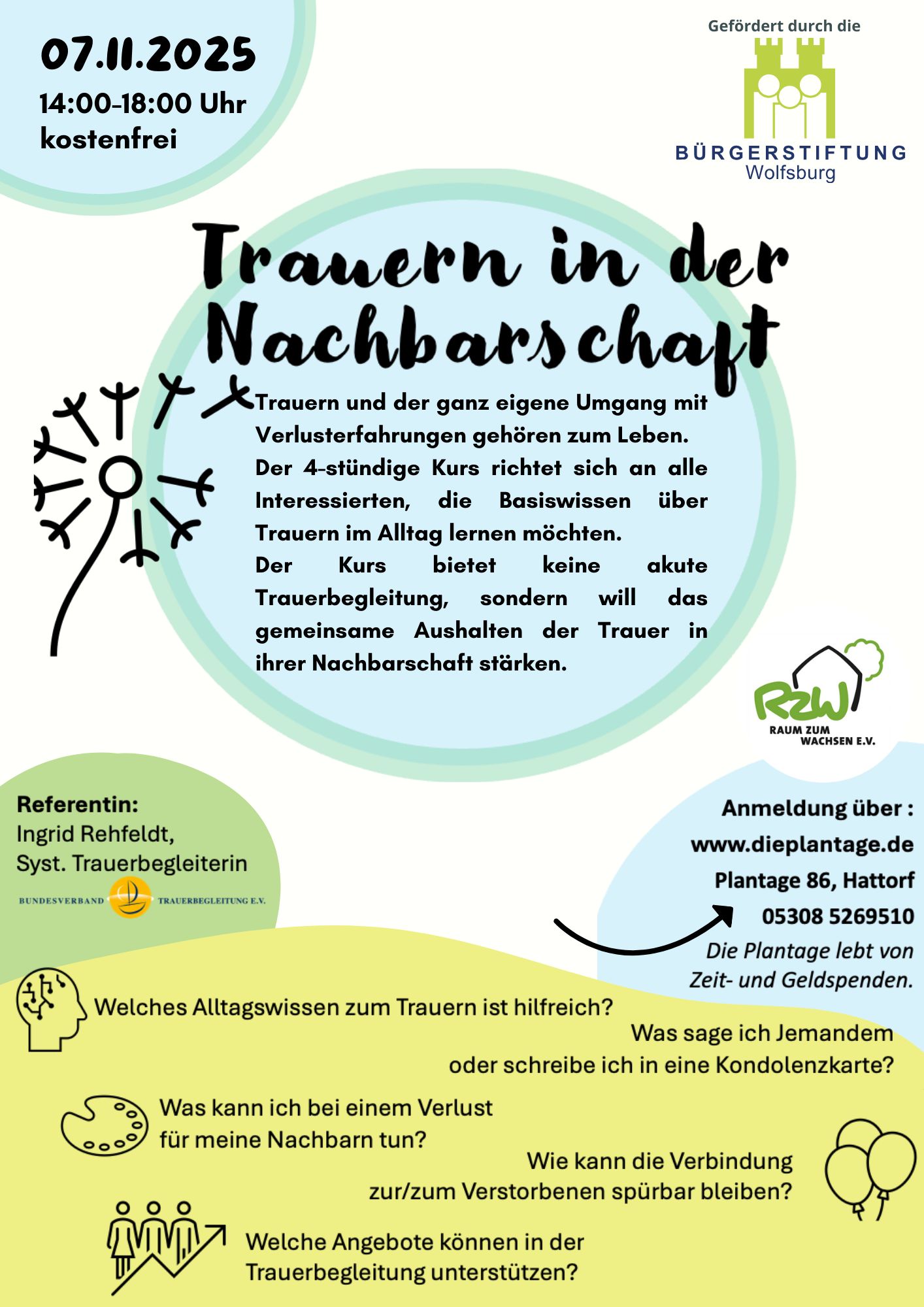 Am 13. Juni fand in der Plantage eine Trauerschulung mit neun Teilnehmenden statt. Unter der Leitung von Ingrid Rehfeldt ging es um die vielen Facetten von Trauer – Gefühle, Gedanken, körperliche Reaktionen und den Umgang im sozialen Umfeld.